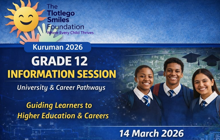 The Grade 12 Information Session supports matric learners in Kuruman and the wider John Taolo Gaetsewe District as they prepare for life after school. The session provides guidance on university and college applications, bursaries, career options, and post-school pathways. To ensure wider access, the event will also be livestreamed, allowing learners from additional schools and remote areas to participate virtually.